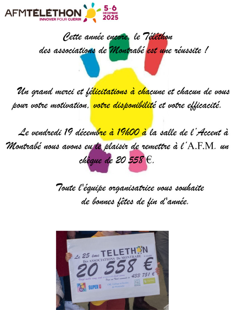 Voila déjà 25 ans que les associations culturelles, sportives et caritatives ainsi que de nombreux bénévoles de Montrabé unissent leurs forces autour d’une même cause… le Téléthon. 25 années de spectacle, 25 années d’exploits sportifs, 25 années de fête, d’émotion et d’espoir. des animations pour tout âge qui ont fait la réputation du Téléthon des associations de Montrabe.